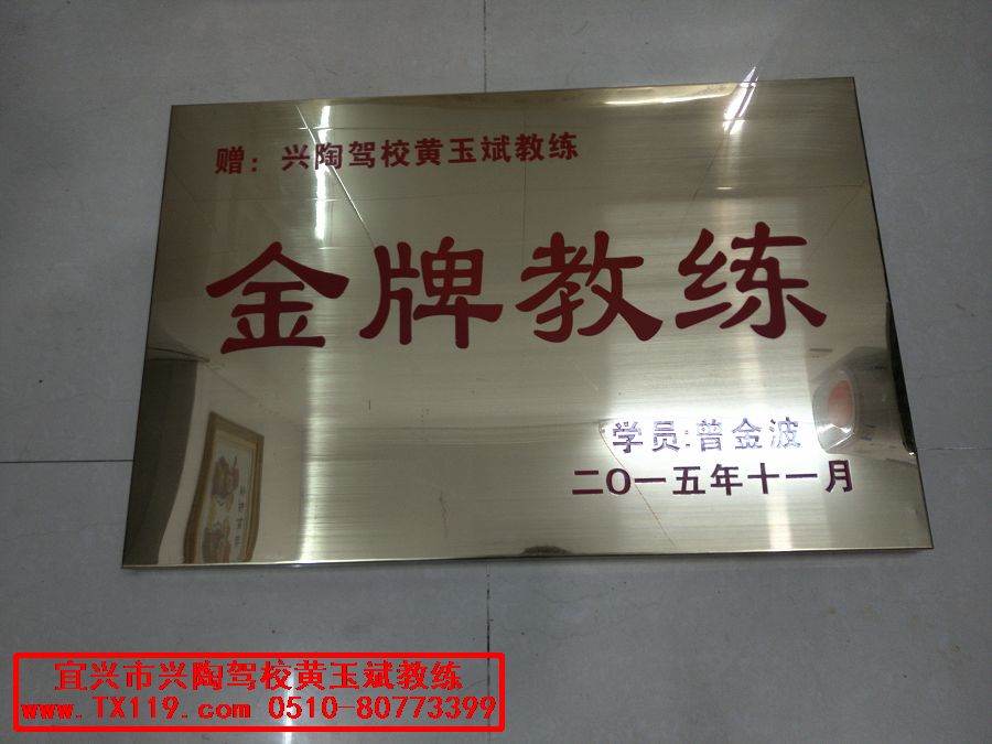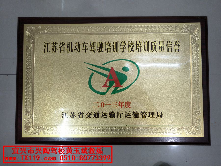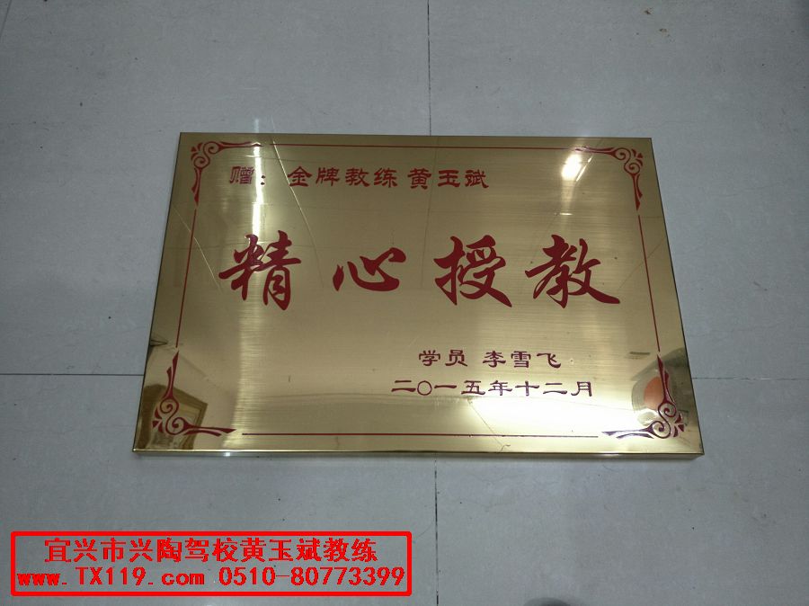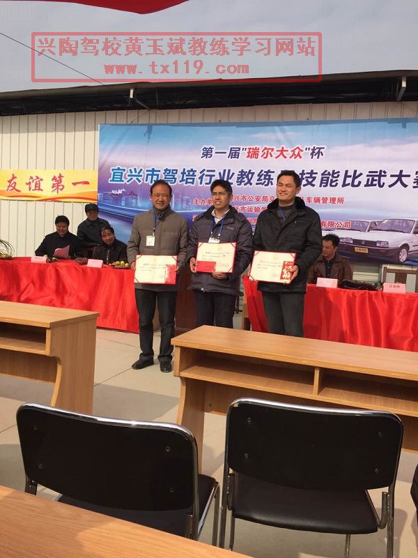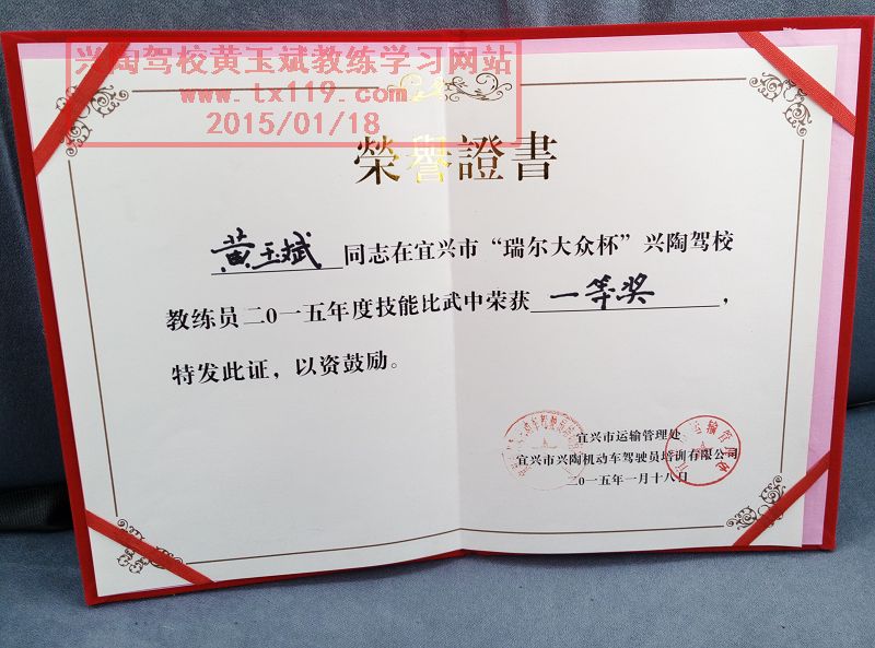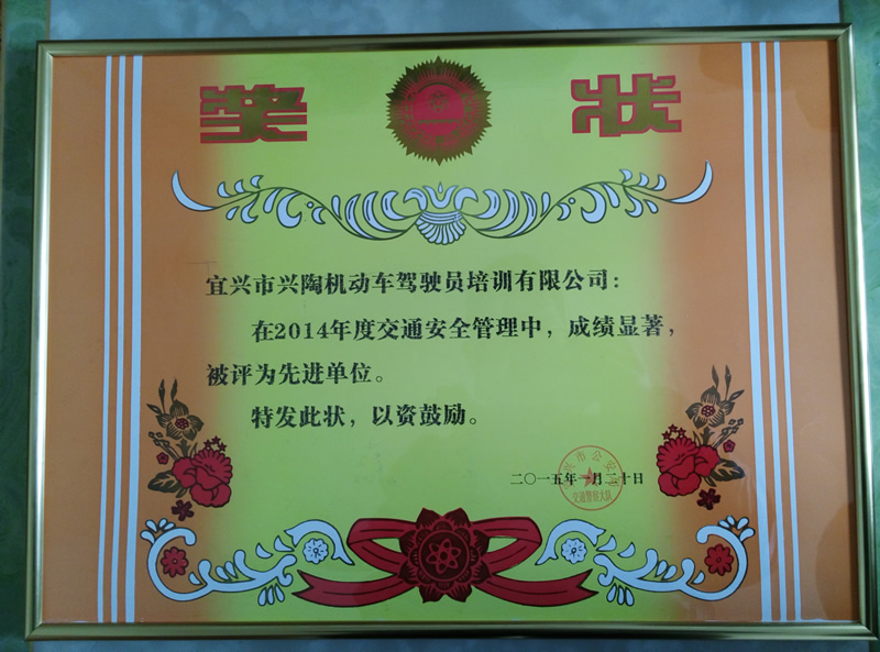 热烈祝贺:2015年1月18日,在宜兴市“瑞尔大众杯”兴陶驾校教练员二0一五年度技能比武中荣获 一等奖 ,由宜兴市运输管理处,宜兴市车管所主办。