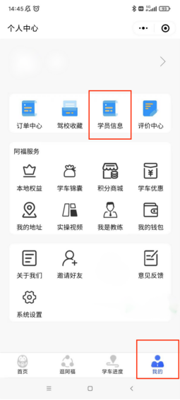 第一步:学员进入“大阿福学车报名平台”小程序,在“我的-学员信息”中完整填写学车人身份信息。