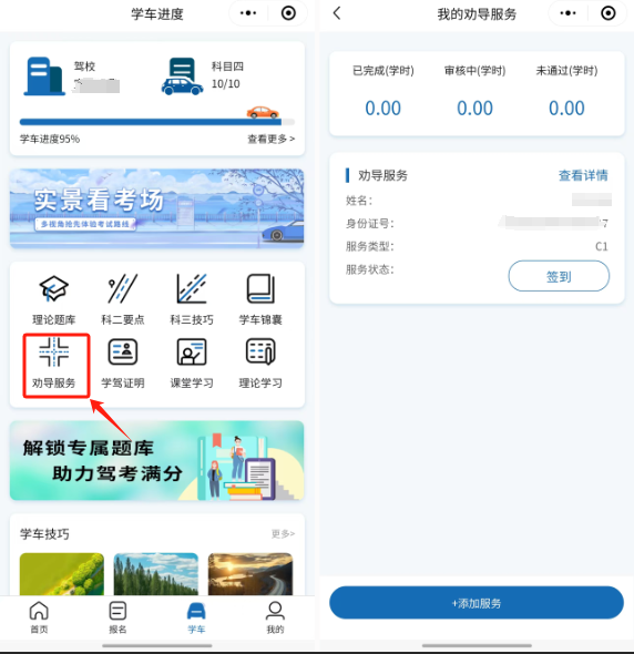 第一步:微信小程序搜索“大阿福学车报名平台 ”进入小程序,点击“劝导服务 ”功能, 授权使用您的手机号,维护学员信息后进入。