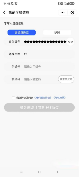 第一步:学员进入“大阿福学车报名平台”小程序,在“我的-学员信息”中完整填写学车人身份信息。